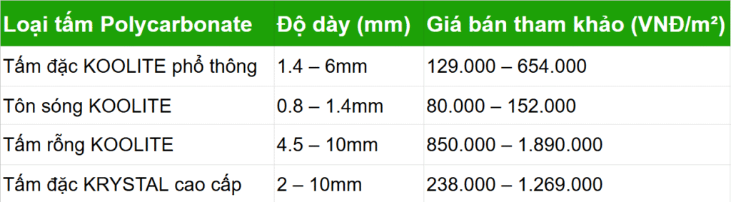 1. BẢNG GIÁ TẤM POLYCARBONATE ƯU ĐÃI
