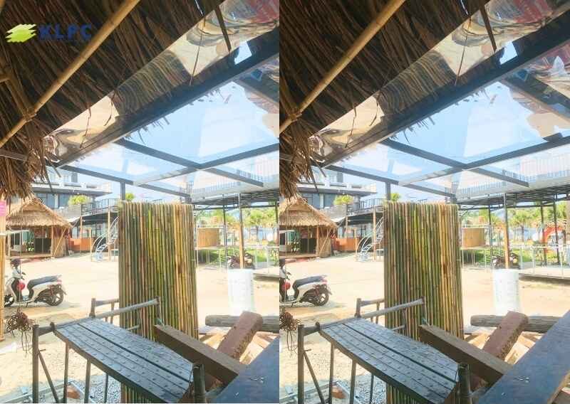 Quán cà phê ngoài trời thường phải đối mặt với ánh nắng gắt. Tấm lợp polycarbonate được phủ lớp chống tia UV hai mặt, giúp: